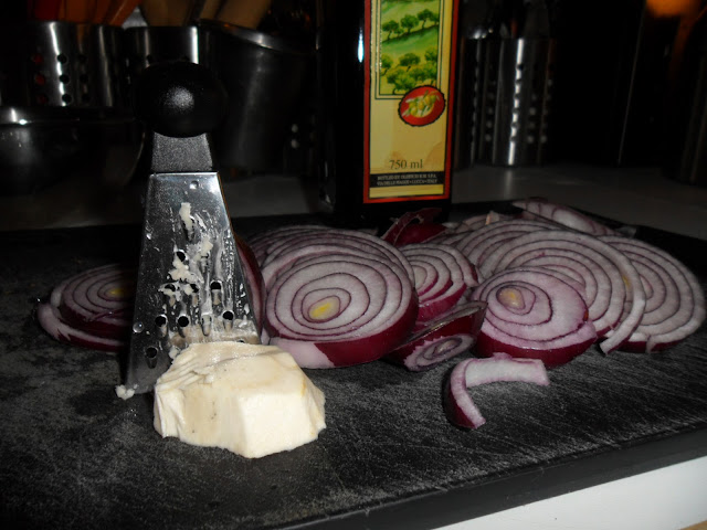 Sipulit ohuiksi viipaleiksi, piparjuuri raasteeksi. Tosi näppärä muuten käytössä tämä miniraastin. Löytö Iittalan tehtaanmyymälästä hintaan 1 €.